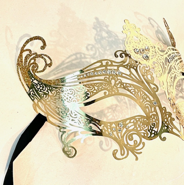 An elaborate Gold Plate Mask made from metal filigree with glittering wings that sweep upward like an angel.
