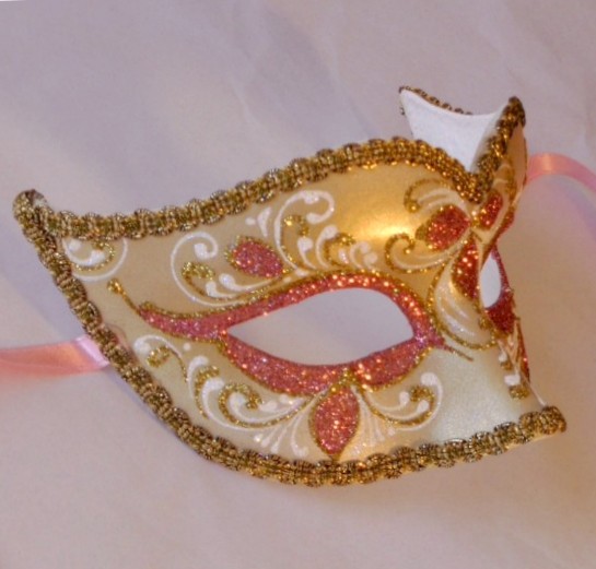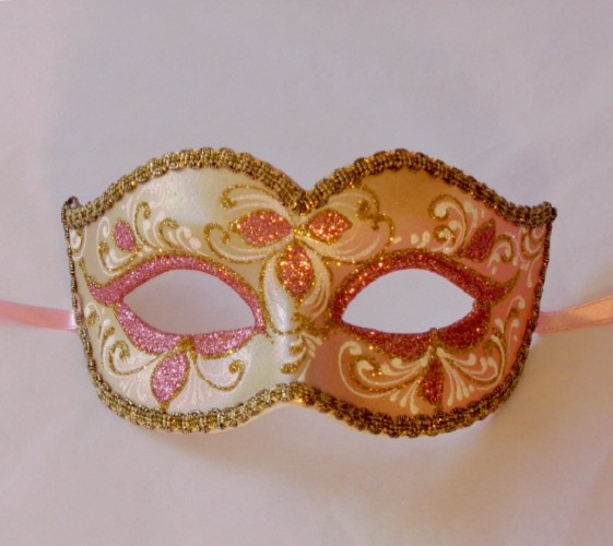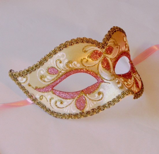 The perfect Pink Mask the lady who loves the color rose. Hand decorated in Gold, White and Rose Pink it glitters in romantic pink.