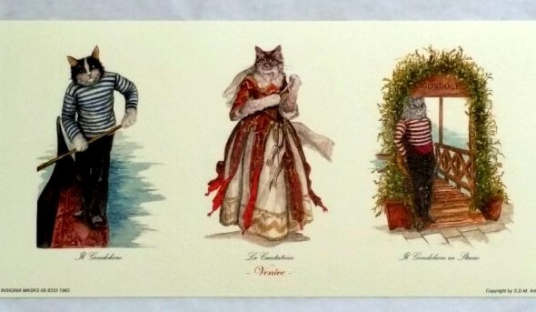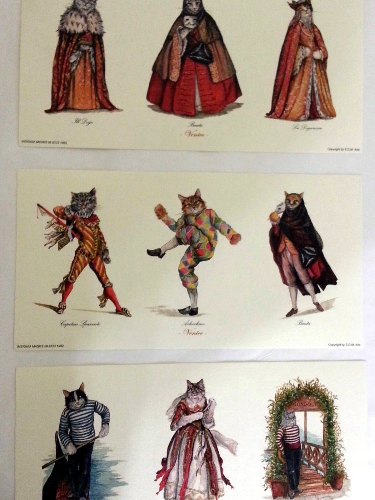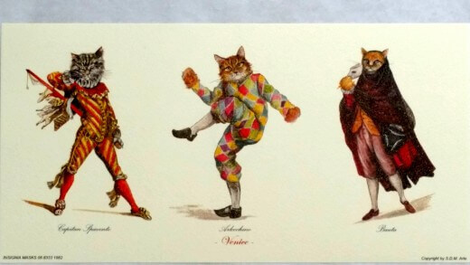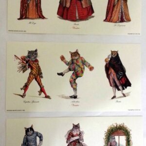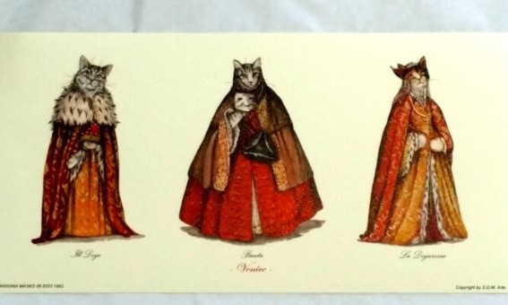 Three Cat Prints, 9 Cats in total. These Gorgeous Cats are dressed for Venetian Carnival in the very best of outfits. You will receive Doge, his wife the Dogaressa, Bauta, Arlechino, Capitano, Dottore and other Venetian aristocracy.