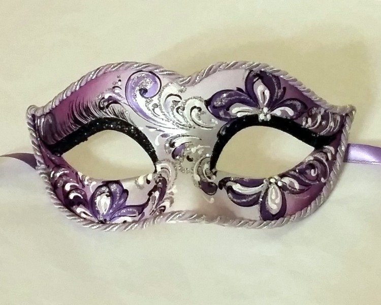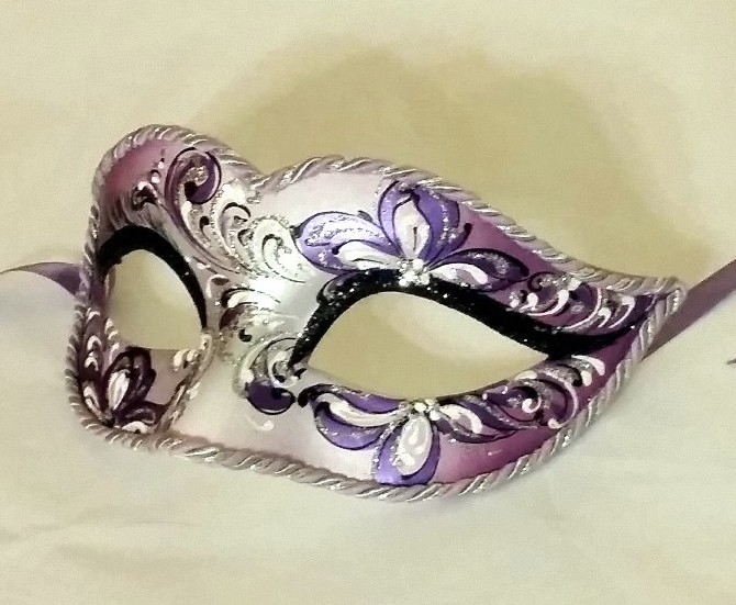 Beautiful Purple Masquerade Mask with hand painted artwork in lavender, purple and silver. The mask itself is a contemporary modern style so that it is brief.