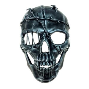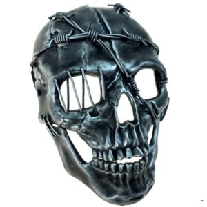 Exposed teeth, slightly crooked with a jaw that appears to be held together with barbed wire so the skull is edgy and aged. In fact the skull barbed wire mask is quite strong and only appears to be fragmented. What looks like barbed wire is soft plastic so that it is not dangerous.