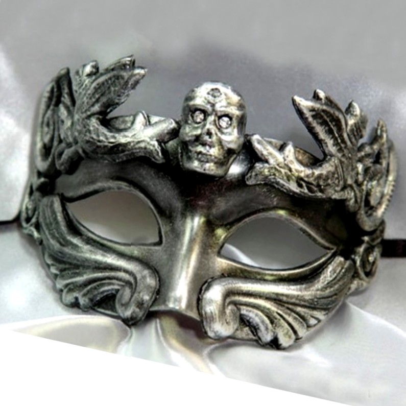Generous fitting men’s Silver Skull Masquerade Mask with Sea serpent and skull decoration in distressed silver. This mask is very popular with the guys and fun to wear.